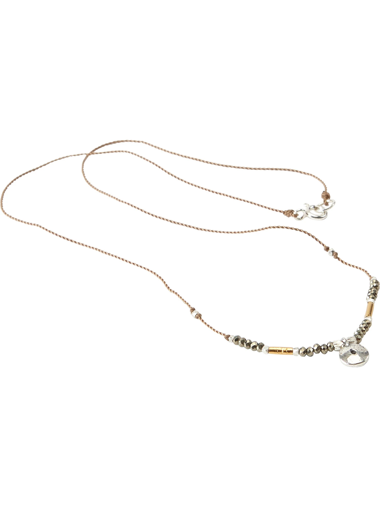 Local artisan Bronwen Lodato was an Outward Bound instructor when she began to field requests for jewelry that would pair elegant simplicity with lasting craftsmanship. Jewelry that is feminine. Jewelry that is made to survive the rigors of the outdoors. This necklace is no exception, with faceted turquoise or pyrite gemstones, handmade Thai beads, silver and 24K gold vermeil, and a lightweight yet super durable nylon cord. 16″ long. By Bronwen Jewelry. One size.